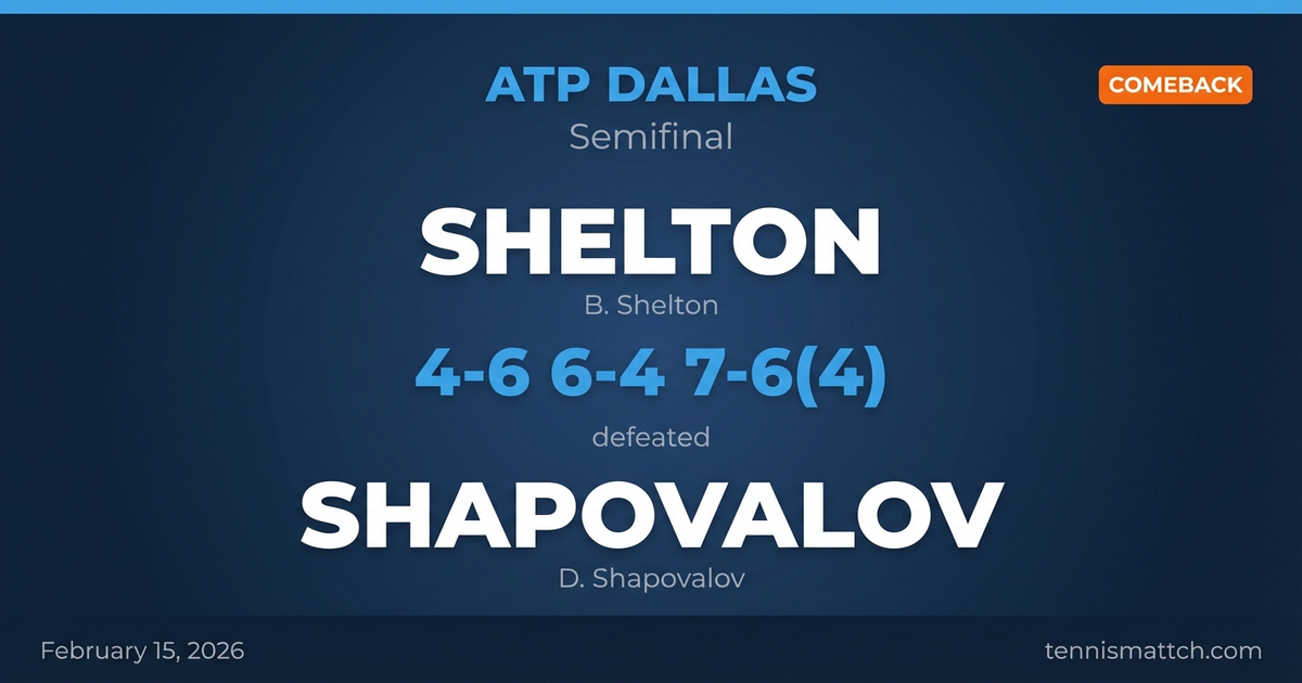 Ben Shelton rallied from a set down to defeat Denis Shapovalov 4-6, 6-4, 7-6(4) in the ATP Dallas semifinals on February 15, 2026. The American showed resilience on the indoor hard courts, fighting back after Shapovalov controlled the opening set to force a deciding third that required a tiebreak.
